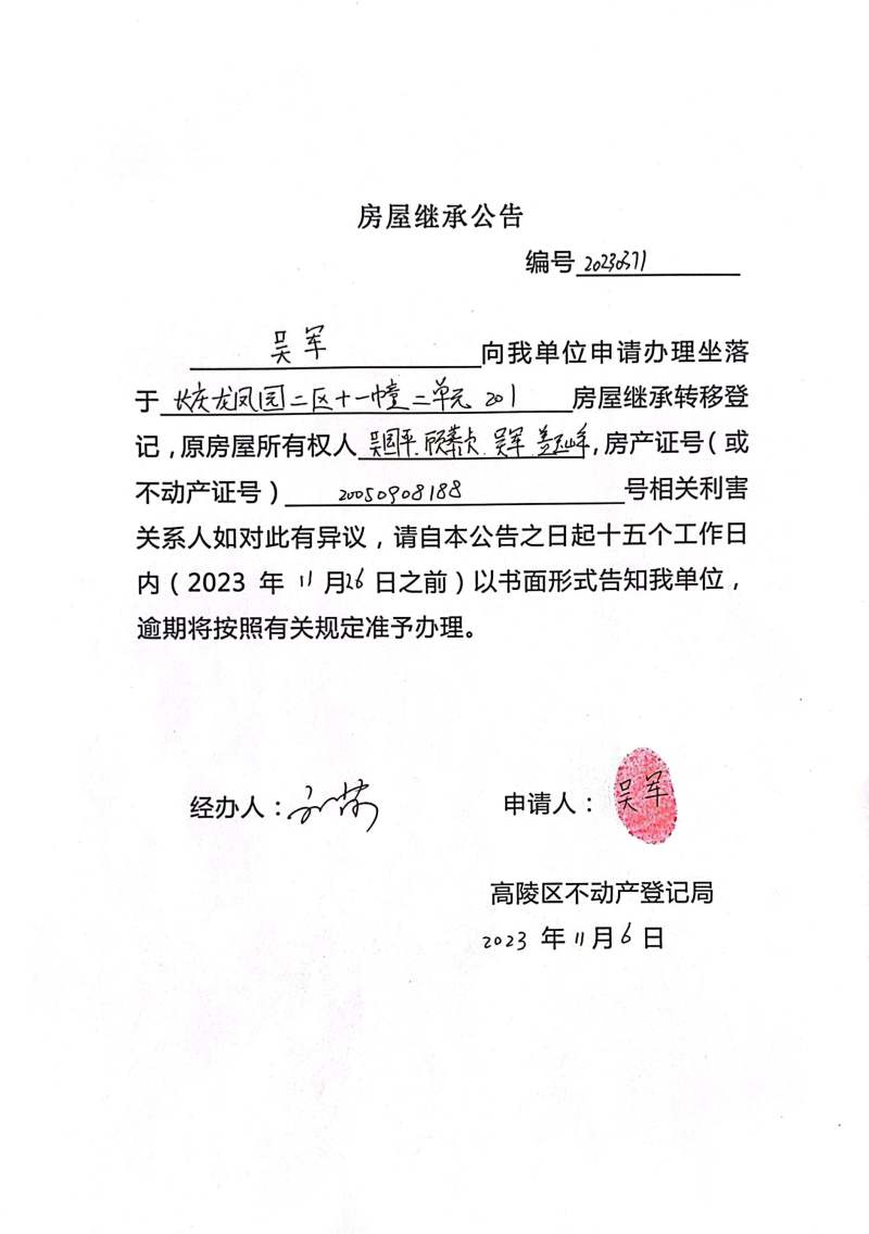 吳軍房屋繼承公告 編號:202300371