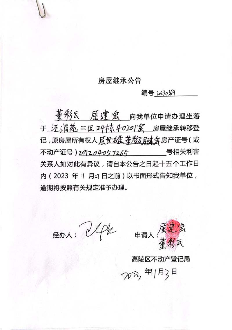董彩云、屈建宏房屋繼承公告 編號:202300369