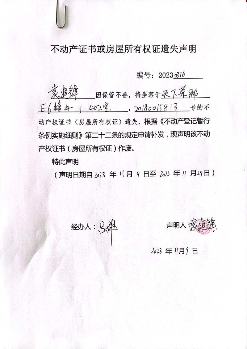不動產證書或房屋所有權證遺失聲明 編號:20230376