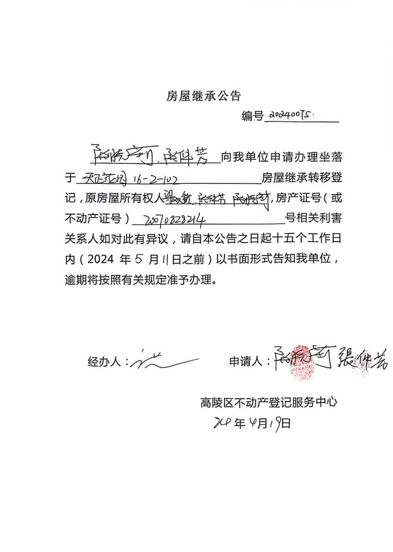 張曉莉、張仲芳房屋繼承公告 編號(hào):20240075
