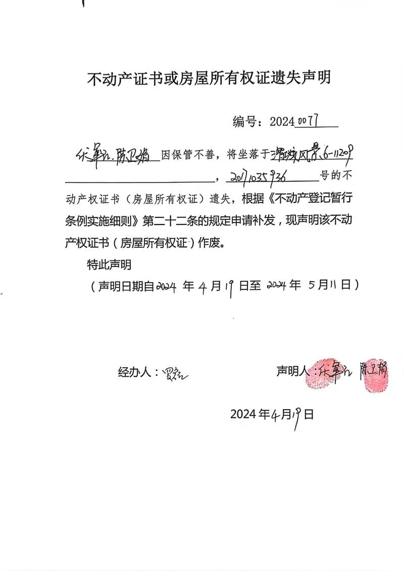 伏軍紅、陳衛(wèi)娟不動(dòng)產(chǎn)證書或房屋所有權(quán)證遺失聲明編號(hào):20240077