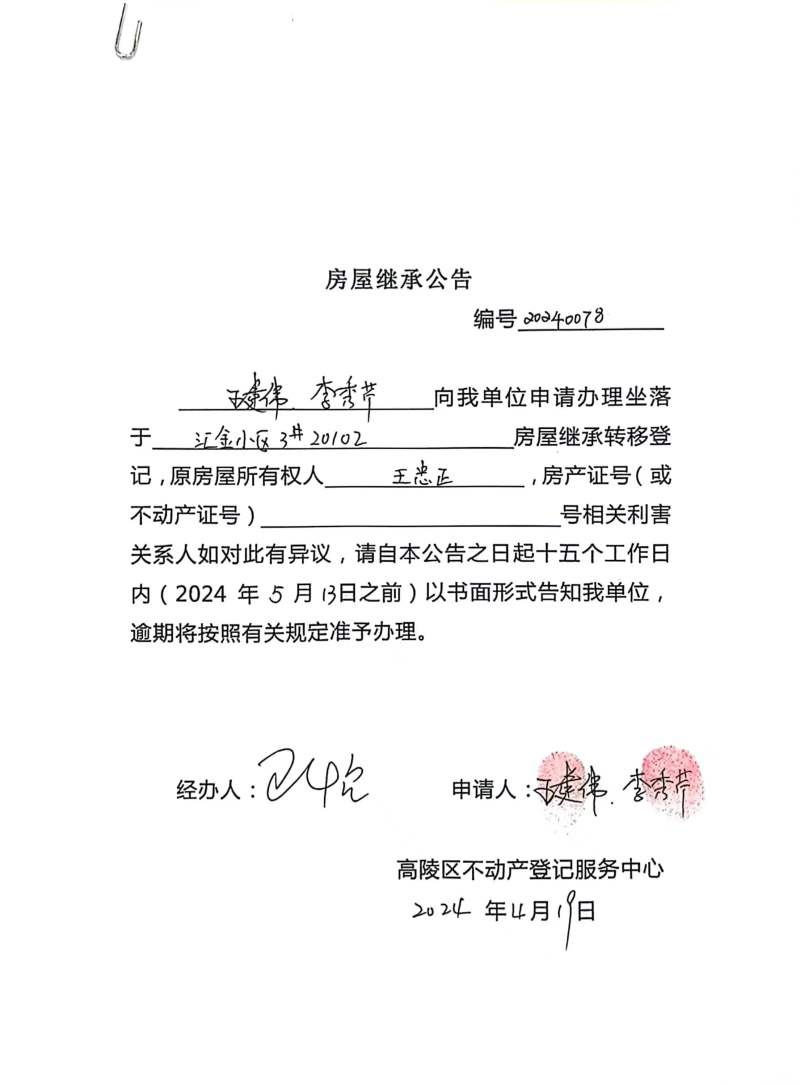 王建偉、李秀芹房屋繼承公告 編號:20240078