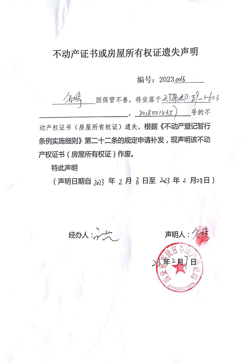 谷婷不動(dòng)產(chǎn)證書或房屋所有權(quán)證遺失聲明 編號(hào):20230016