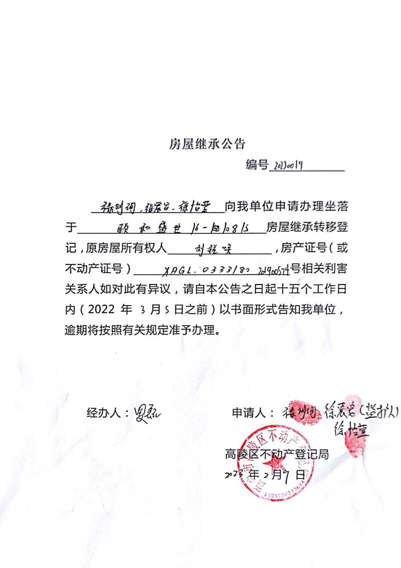 徐劉絢、徐震安、徐怡萱房屋繼承公告 編號:20230019
