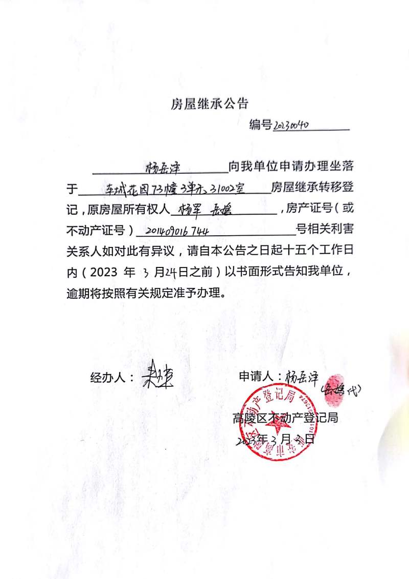 楊岳澤房屋繼承公告 編號:20230040
