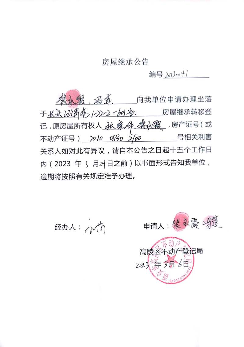 裴永霞、馮蓮房屋繼承公告 編號:20230041