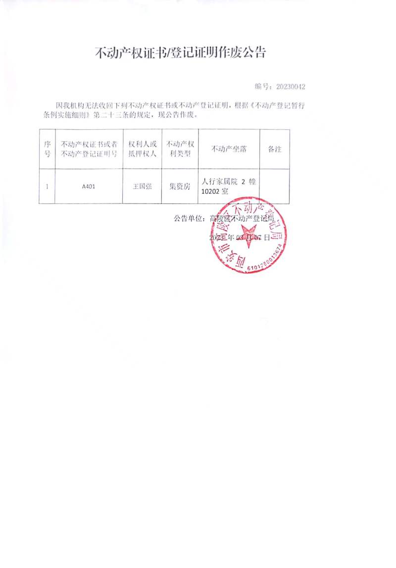王國強不動產權證書/登記證明作廢公告編號:20230042