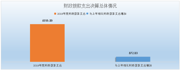 2019年度財政撥款支出6355.89萬元,占本年支出合計的100%。與上年相比,財政撥款支出增加872.83萬元,增長13.73%,主要原因是城鄉社區和住房保障支出的增加。