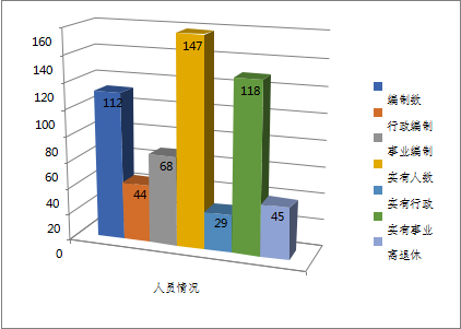 截止2019年底實有147人,本部門人員編制112人。其中行政編制44人、事業編制68人;實有人員147人,其中行政29人、事業118人。單位管理的離退休人員45人。