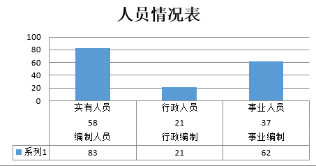截止2019年底,本部門人員編制58人,其中行政編制21人、事業編制37人;實有人員83人,其中行政21人、事業62人。單位管理的離退休人員0人。