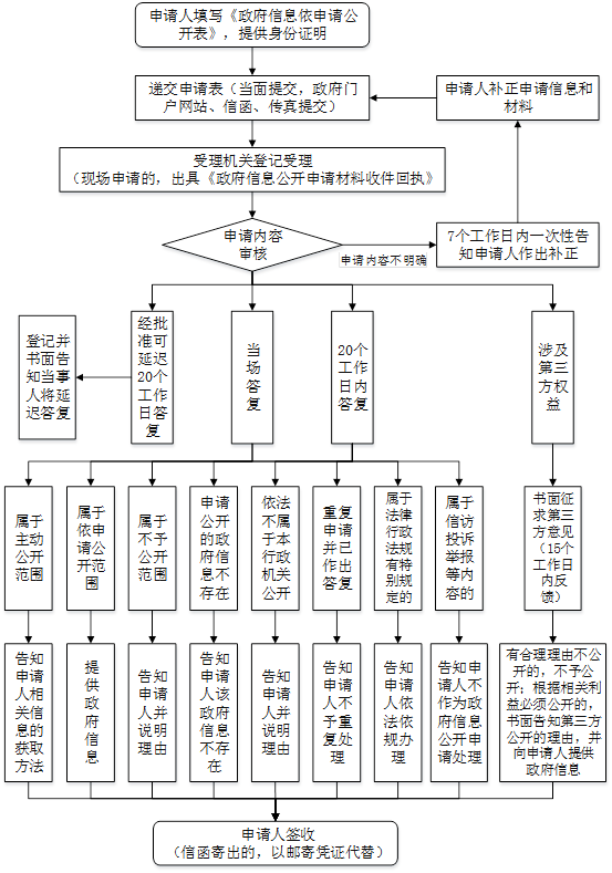 受理機構(gòu)收到《申請表》后可根據(jù)申請人要求向申請人出具回執(zhí)。本機關(guān)收到申請后,應(yīng)按照登記、審查、辦理、答復(fù)、歸檔流程辦理,能夠當場答復(fù)的當場答復(fù),不能當場答復(fù)的,自收到申請之日起20個工作日內(nèi)作出下列書面答復(fù):