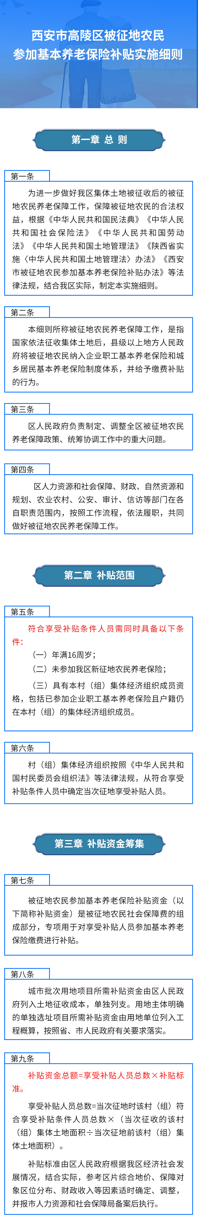 第一條 為進一步做好我區集體土地被征收后的被征地農民養老保障工作,保障被征地農民的合法權益,根據《中華人民共和國民法典》《中華人民共和國社會保險法》《中華人民共和國勞動法》《中華人民共和國土地管理法》《陜西省實施〈中華人民共和國土地管理法〉辦法》《西安市被征地農民參加基本養老保險補貼辦法》等法律法規,結合我區實際,制定本實施細則。