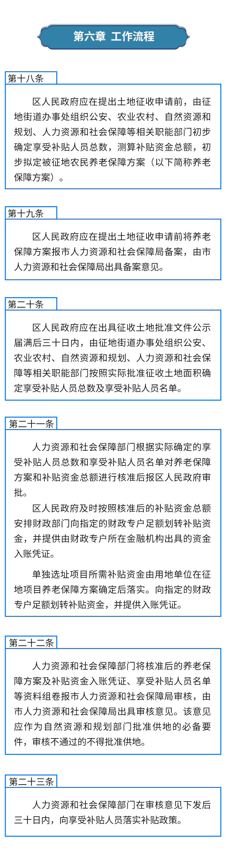 第二十二條 人力資源和社會保障部門將核準后的養老保障方案及補貼資金入賬憑證、享受補貼人員名單等資料組卷報市人力資源和社會保障局審核,由市人力資源和社會保障局出具審核意見。該意見應作為自然資源和規劃部門批準供地的必備要件,審核不通過的不得批準供地。