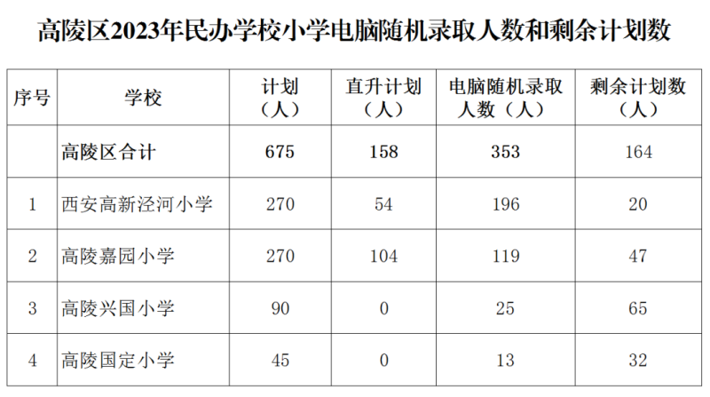 根據(jù)《西安市教育局關于做好2023年義務教育招生入學工作的通知》(市教發(fā)〔2023〕55號)要求,我區(qū)民辦小學招生計劃數(shù)共675人,2023年7月23日電腦隨機錄取353人,剩余計劃數(shù)164人,現(xiàn)公布如下: