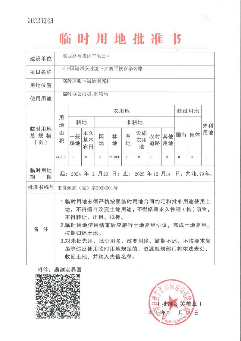 210國道西安過境下大寨至侯官寨公路臨時用地批準書