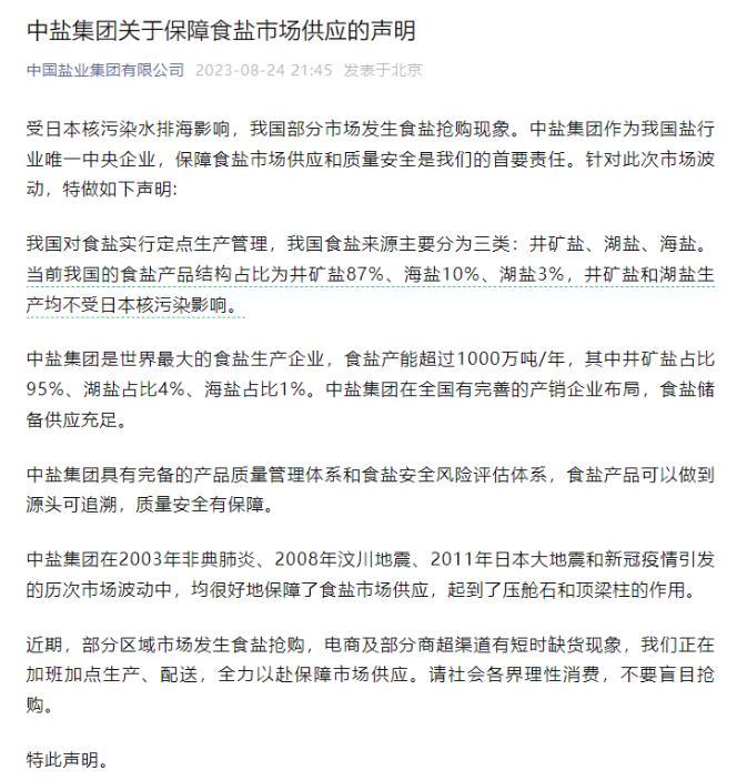 隨著日本宣布于2023年8月24日下午啟動福島核污染水排海,我國部分地區(qū)出現(xiàn)民眾搶購食鹽現(xiàn)象。在此,陜西省鹽業(yè)專營有限責(zé)任公司(以下簡稱“陜西鹽業(yè)公司”)提醒廣大消費者,陜西省食鹽供應(yīng)安全充足,市民無需恐慌,不必盲目跟風(fēng)搶鹽,堅決做到不信謠、不傳謠。