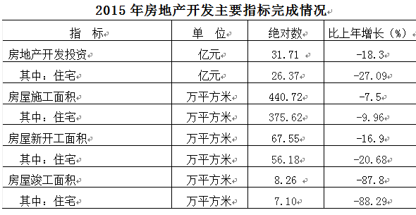 全區房地產開發企業共有31家,開發項目37個。全年房地產開發投資31.71億元,比上年下降17.8%。其中,住宅投資26.37億元,下降27.09%;辦公樓投資0.36億元,是上年的450倍;商業營業用房投資4.04億元,增長90.57%。房屋施工面積440.72萬平方米,下降7.5%;房屋竣工面積8.26萬平方米,下降87.8%。商品房銷售面積40.44 萬平方米,較上年下降47.3%。