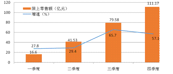 全年社會(huì)消費(fèi)品零售總額完成177.86億元,比上年增長(zhǎng)25.2%。限額以上企業(yè)(單位)在地消費(fèi)品零售額共實(shí)現(xiàn)111.17億元,比上年增長(zhǎng)57.1%。其中,批發(fā)業(yè)實(shí)現(xiàn)限上銷售額80.34億元,比上年下降21.9%;零售業(yè)實(shí)現(xiàn)限上銷售額111.11億元,比上年增長(zhǎng)59.3%;餐飲業(yè)實(shí)現(xiàn)限上營(yíng)業(yè)額1.01億元,比上年下降46.3%;住宿業(yè)實(shí)現(xiàn)限上營(yíng)業(yè)額0.07億元,比上年下降25.4%;全年限額以上企業(yè)(單位)區(qū)屬消費(fèi)品零售額共實(shí)現(xiàn)9.15億元,比上年下降13.2%。其中,批發(fā)業(yè)實(shí)現(xiàn)限上銷售額39.04億元,比上年下降0.4%;零售業(yè)實(shí)現(xiàn)限上銷售額9.47億元,比上年下降4.6%;餐飲業(yè)實(shí)現(xiàn)限上營(yíng)業(yè)額0.8億元,比上年下降53.6%;住宿業(yè)實(shí)現(xiàn)限上營(yíng)業(yè)額0.07億元,比上年下降25.4%。