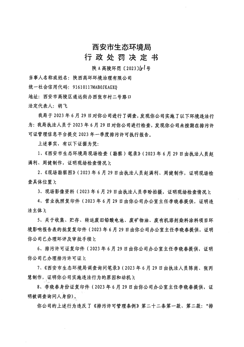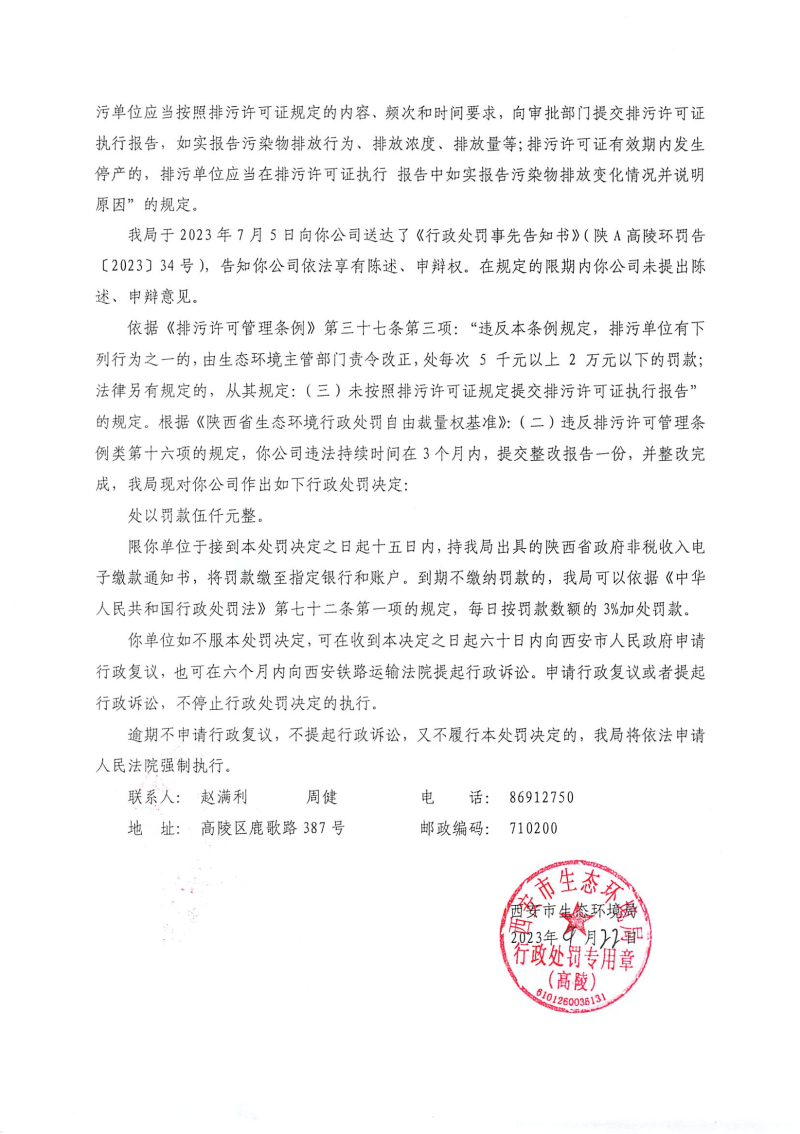 西安市生態環境局行政處罰決定書陜A高陵環罰〔2023〕41號