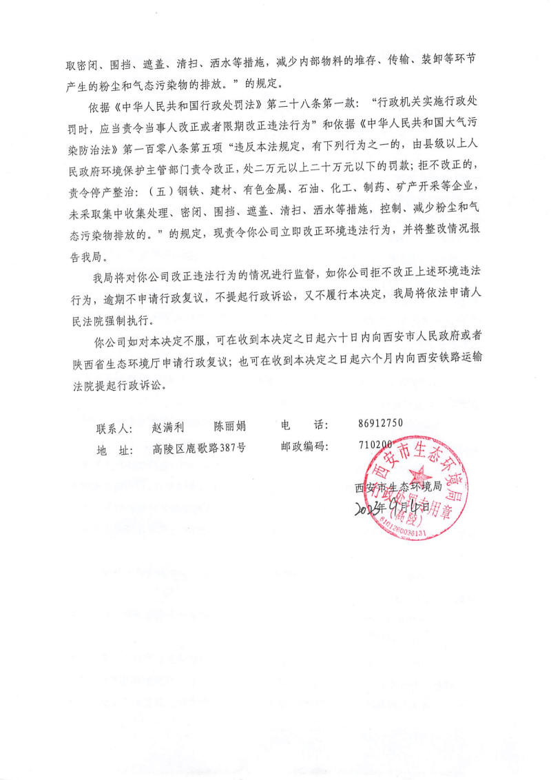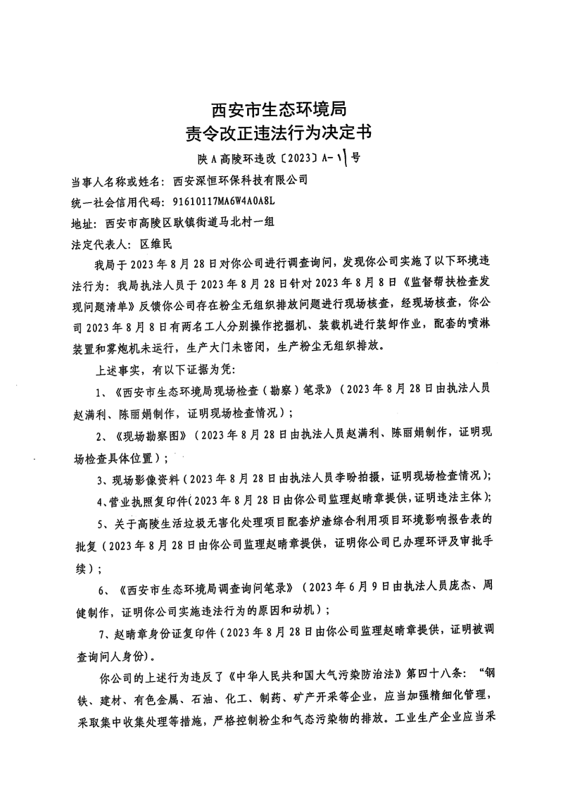 西安市生態(tài)環(huán)境局責(zé)令改正違法行為決定書陜A高陵環(huán)違改〔2023〕A-11號(hào)