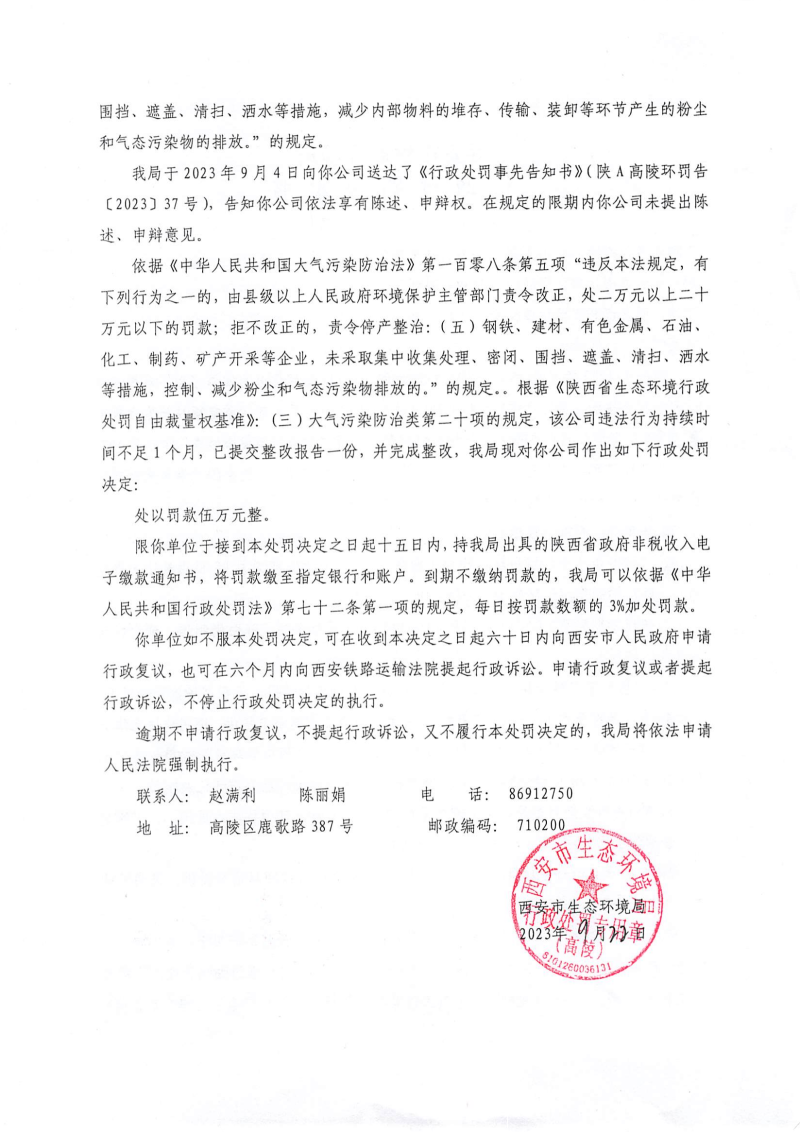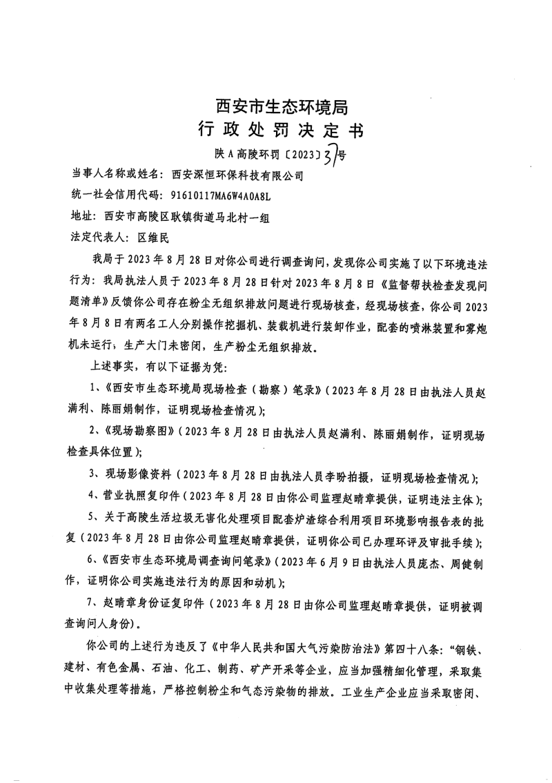 西安市生態環境局行政處罰決定書陜A高陵環罰〔2023〕37號