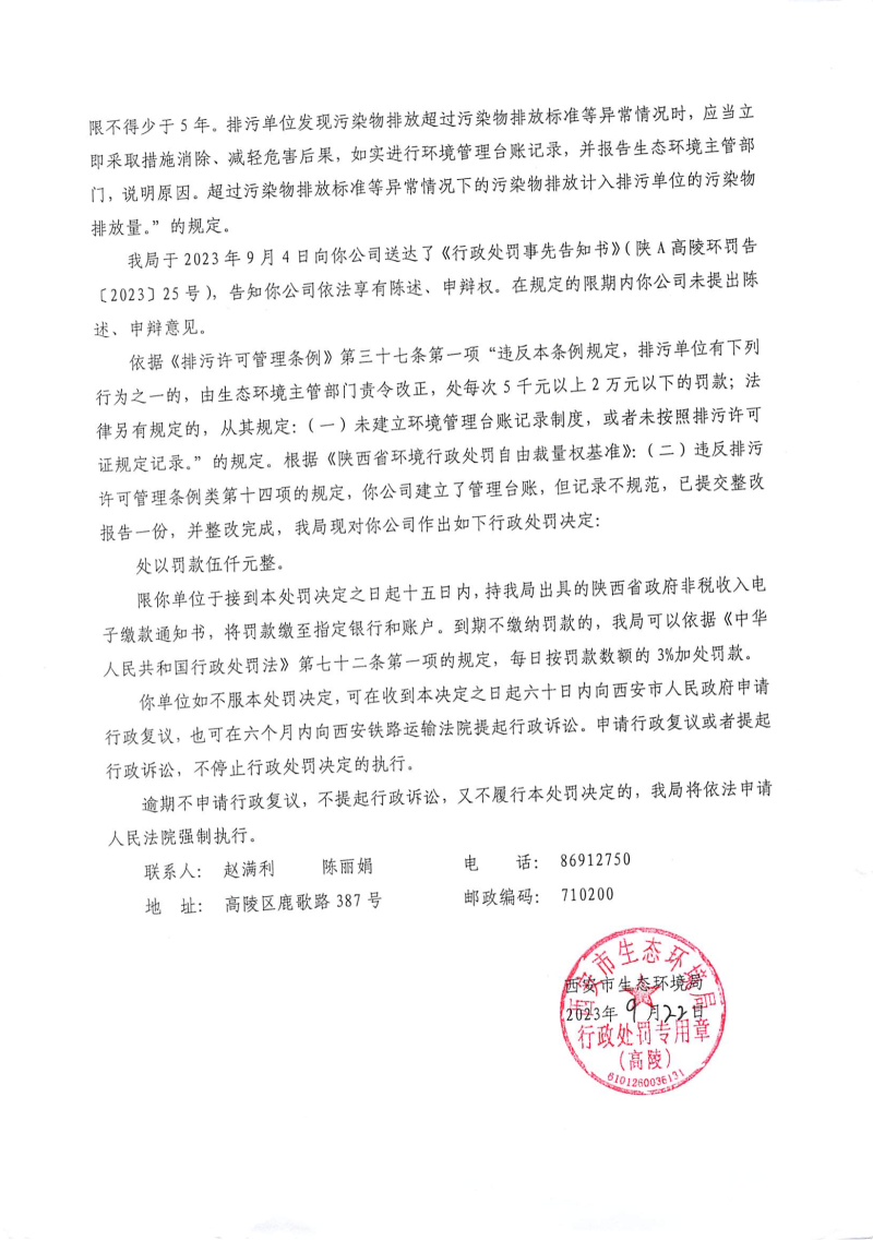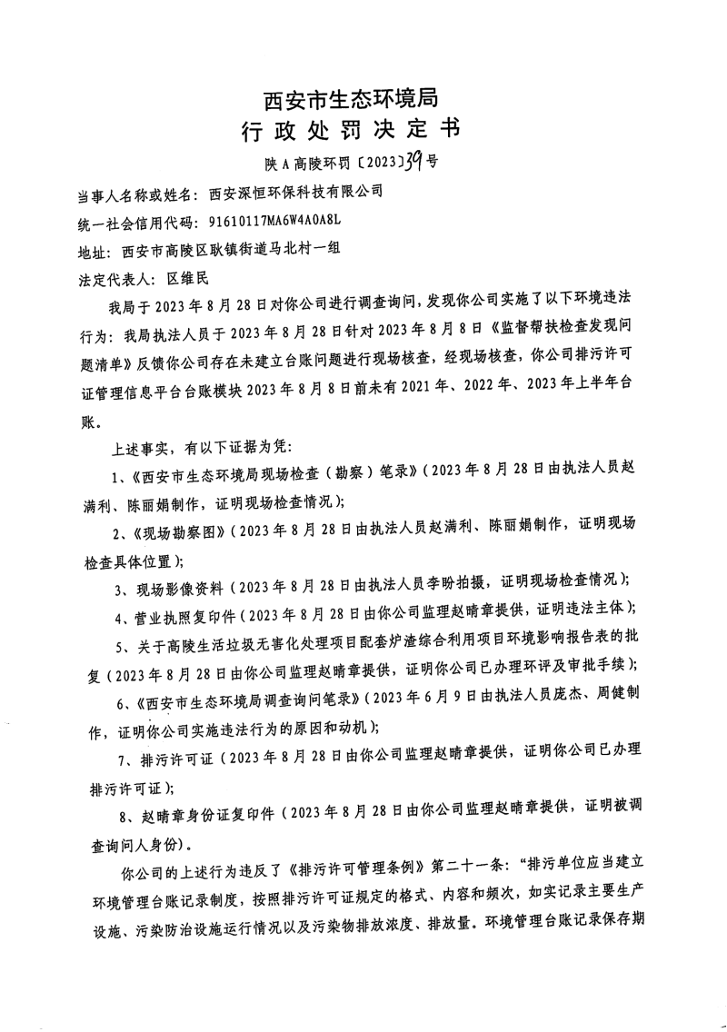 西安市生態環境局行政處罰決定書陜A高陵環罰〔2023〕39號