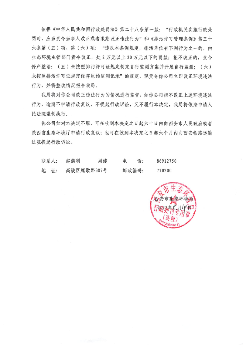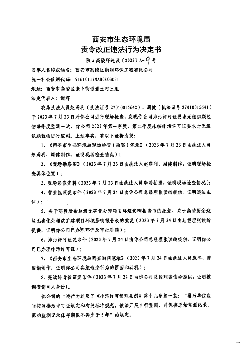 西安市生態環境局責令改正違法行為決定書陜A高陵環違改〔2023〕A-9號