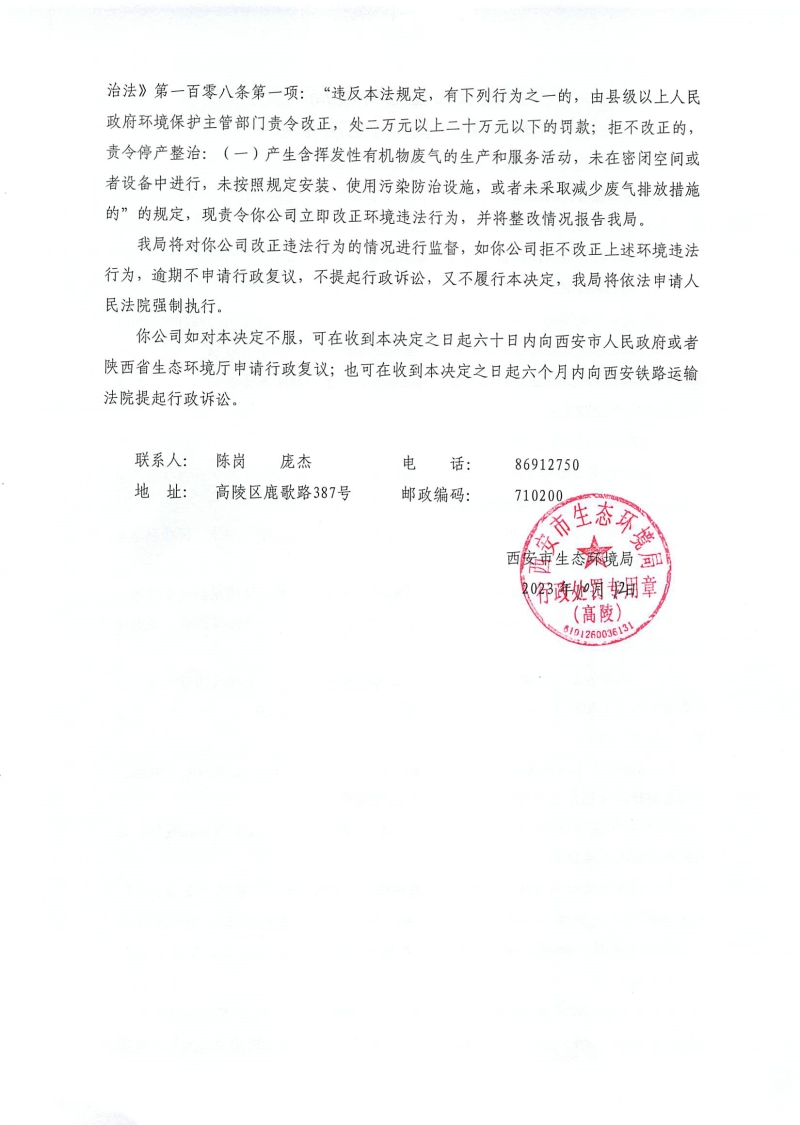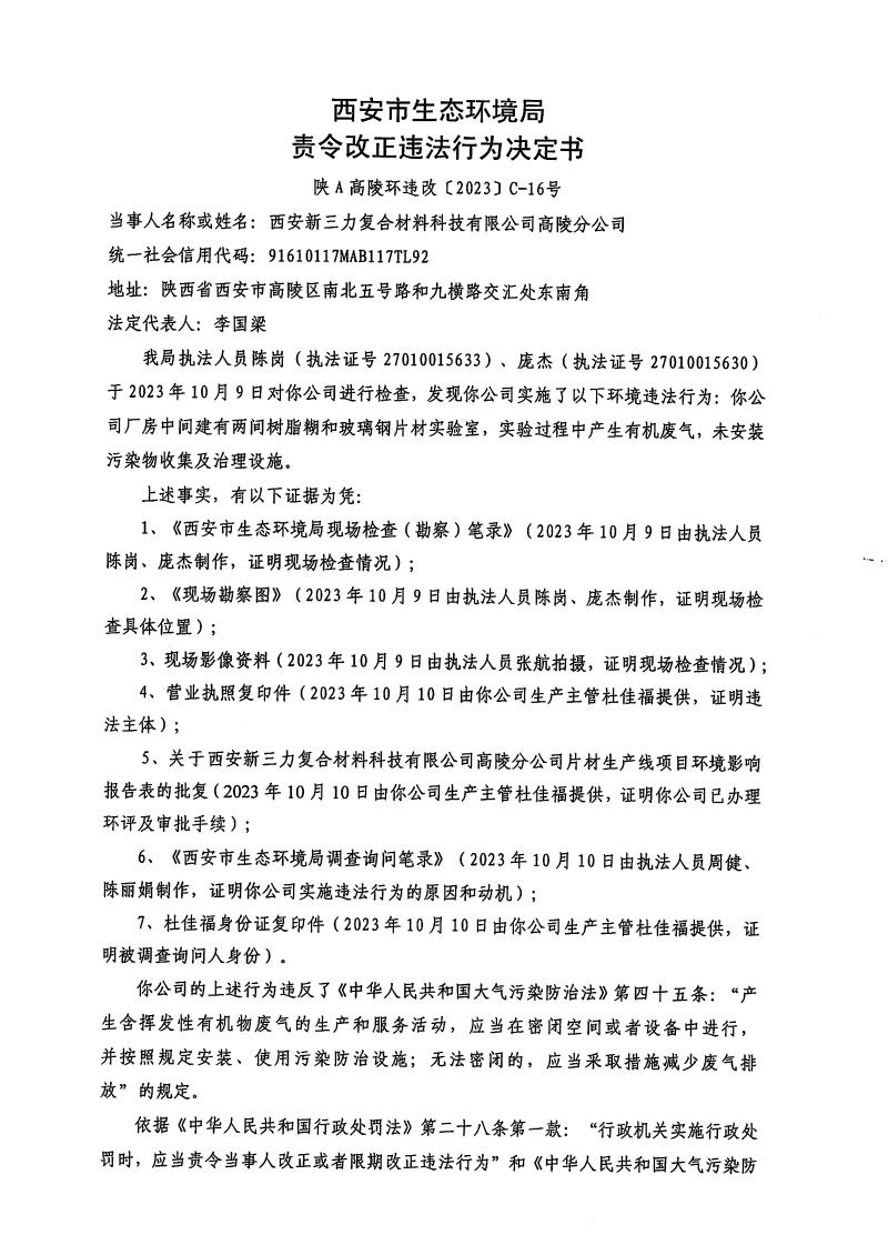 西安市生態(tài)環(huán)境局高陵分局責(zé)令改正違法行為決定書〔2023〕C-16號(hào) |