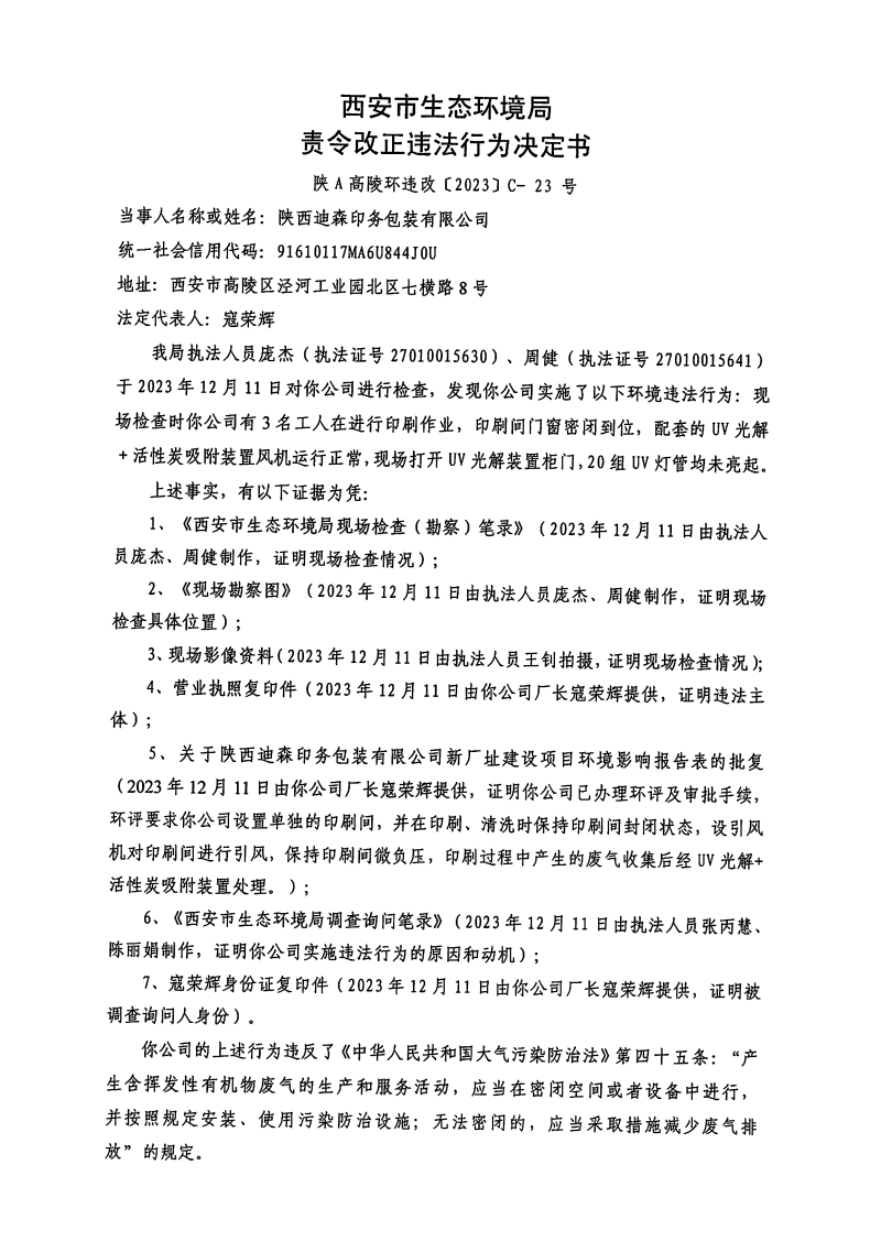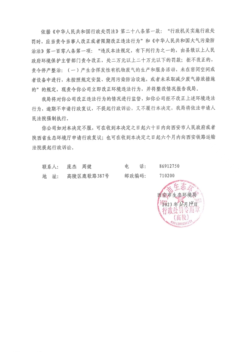 西安市生態(tài)環(huán)境局高陵分局責(zé)令改正違法行為決定書〔2023〕C-23號 |