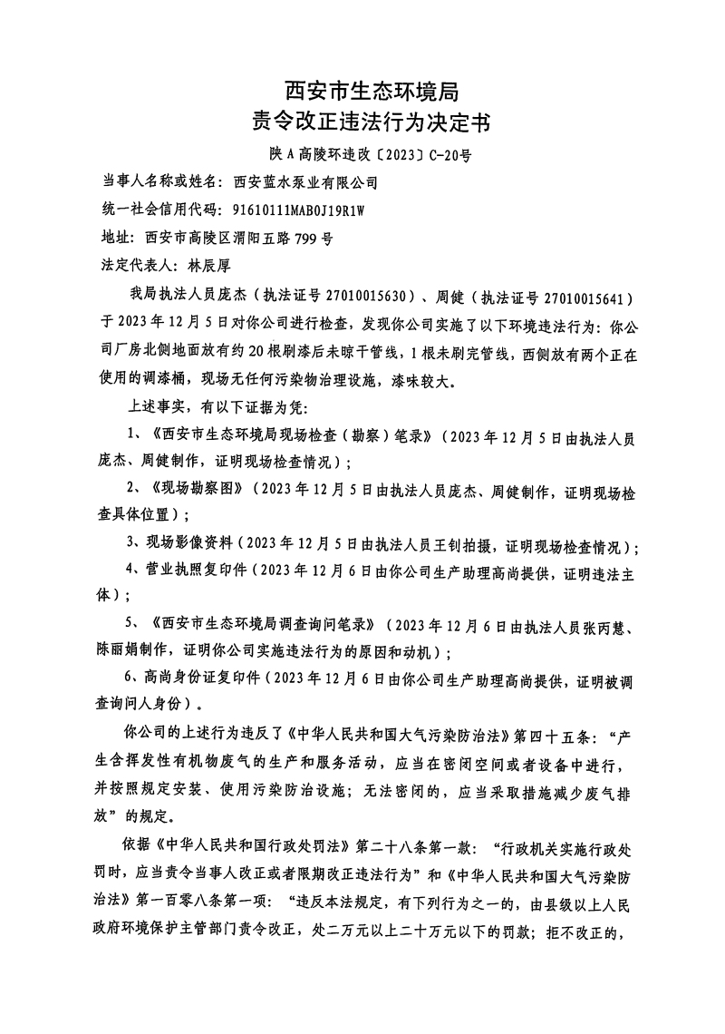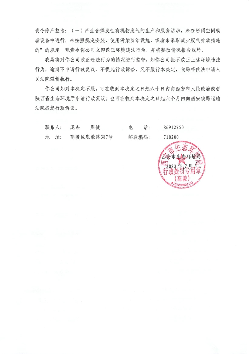 西安市生態環境局高陵分局責令改正違法行為決定書〔2023〕C-20號