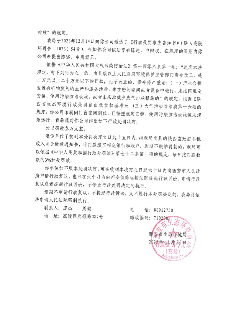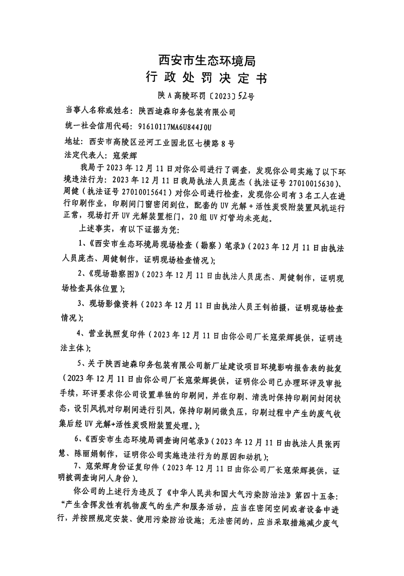 西安市生態環境局行政處罰決定書陜A高陵環罰〔2023〕52號
