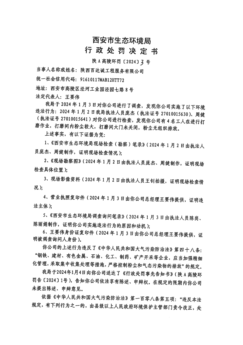 西安市生態(tài)環(huán)境局行政處罰決定書陜A高陵環(huán)罰〔2024〕3號(hào)