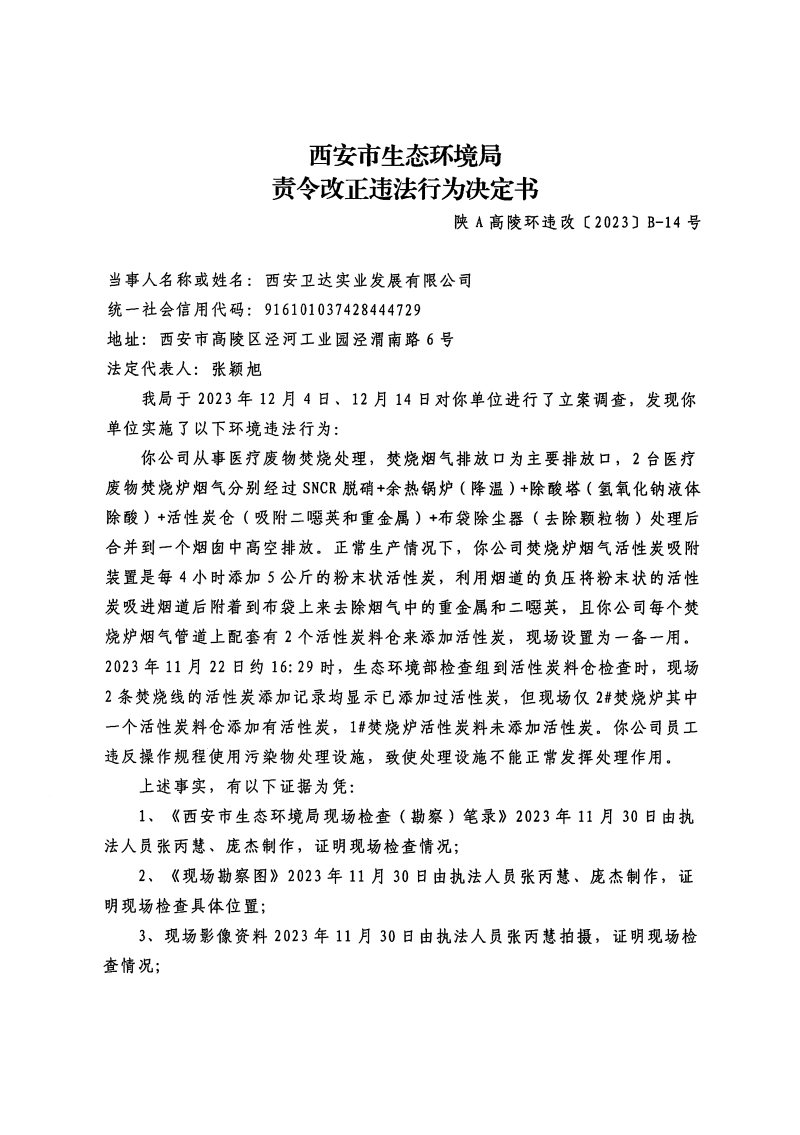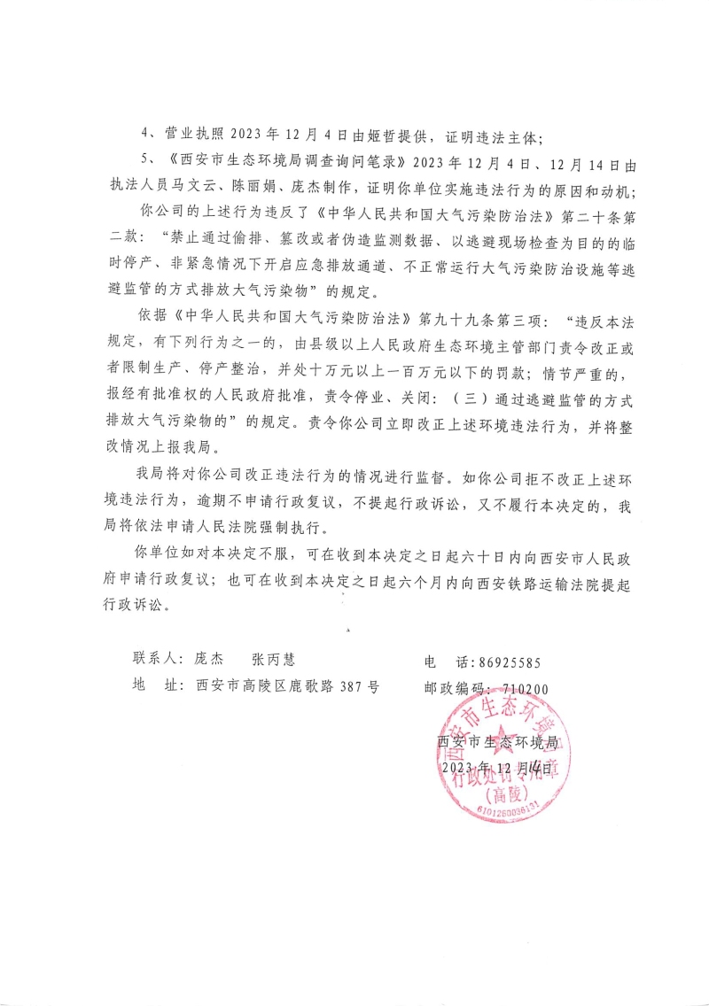 西安市生態環境局高陵分局責令改正違法行為決定書〔2023〕B-14號