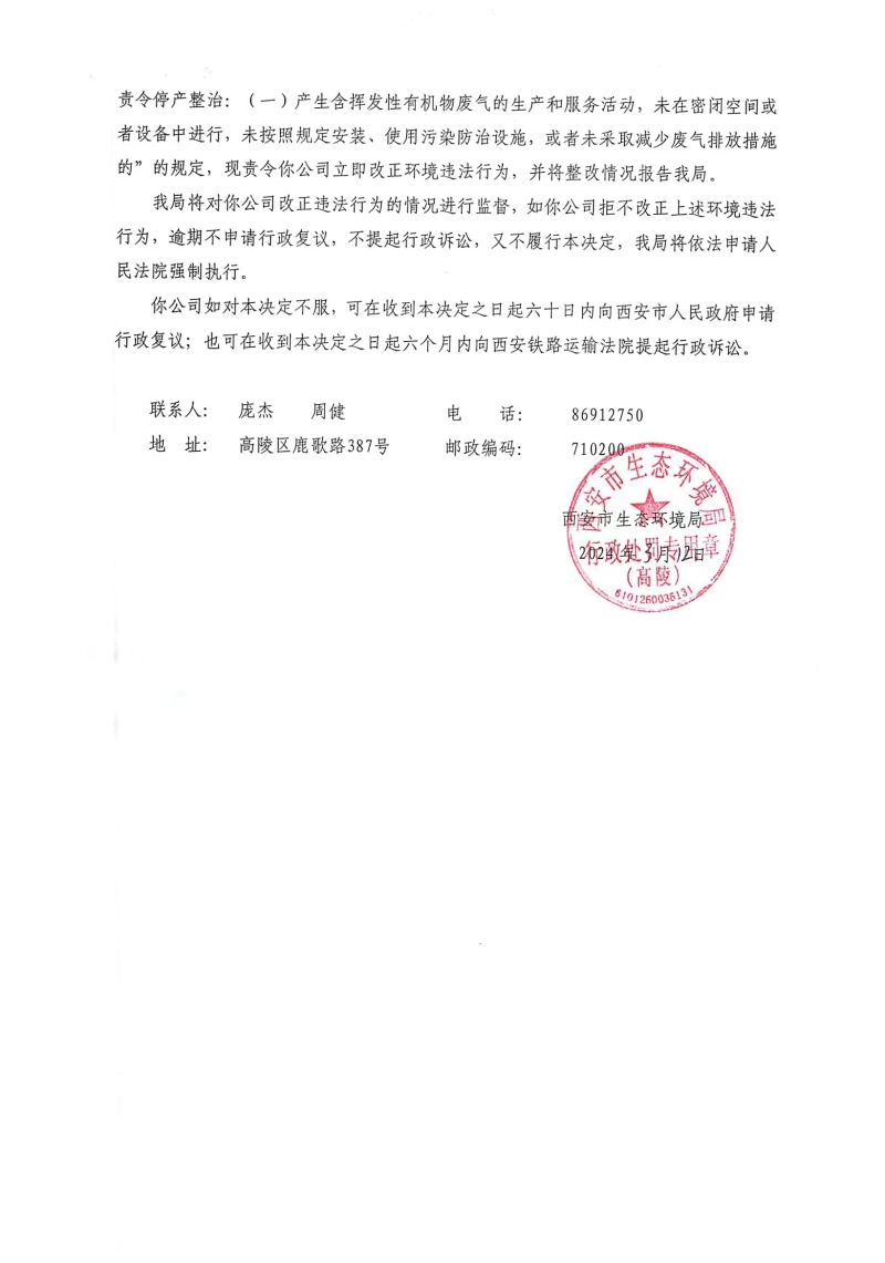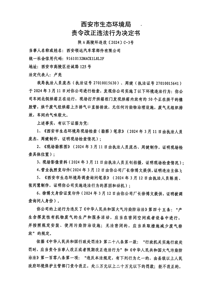 西安市生態(tài)環(huán)境局高陵分局責(zé)令改正違法行為決定書(shū)陜A高陵環(huán)違改〔2024〕C-3號(hào) |