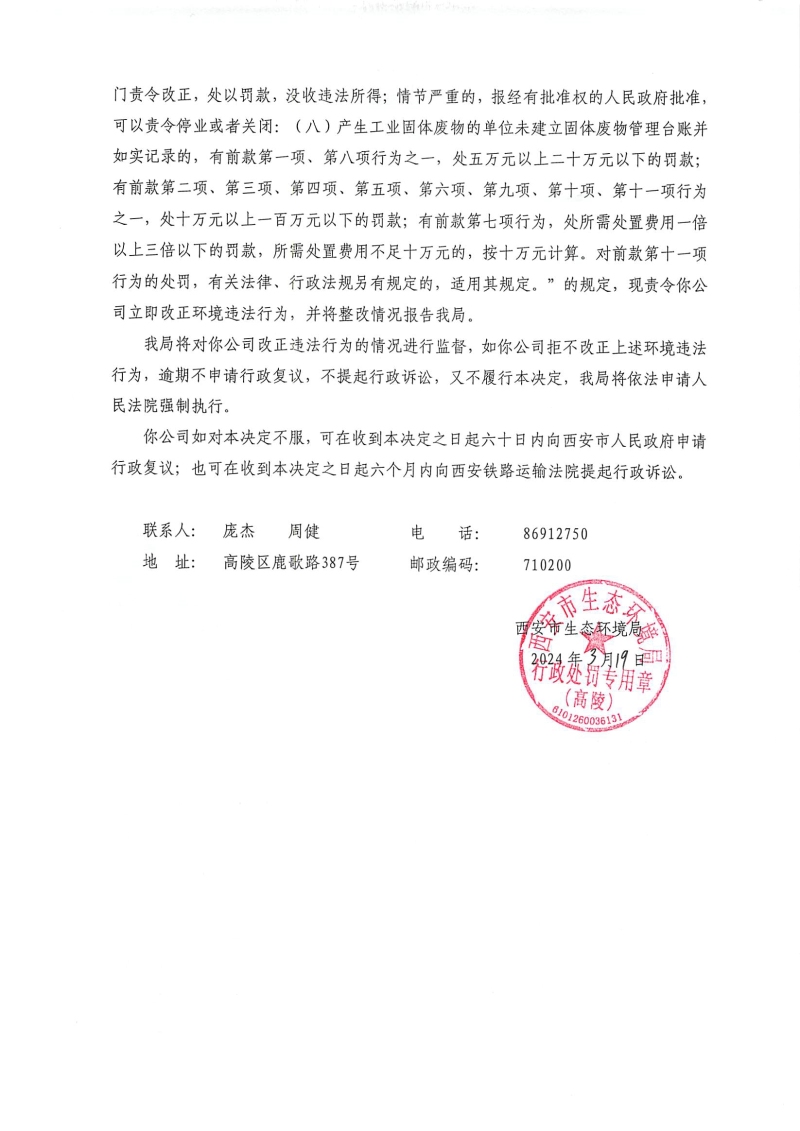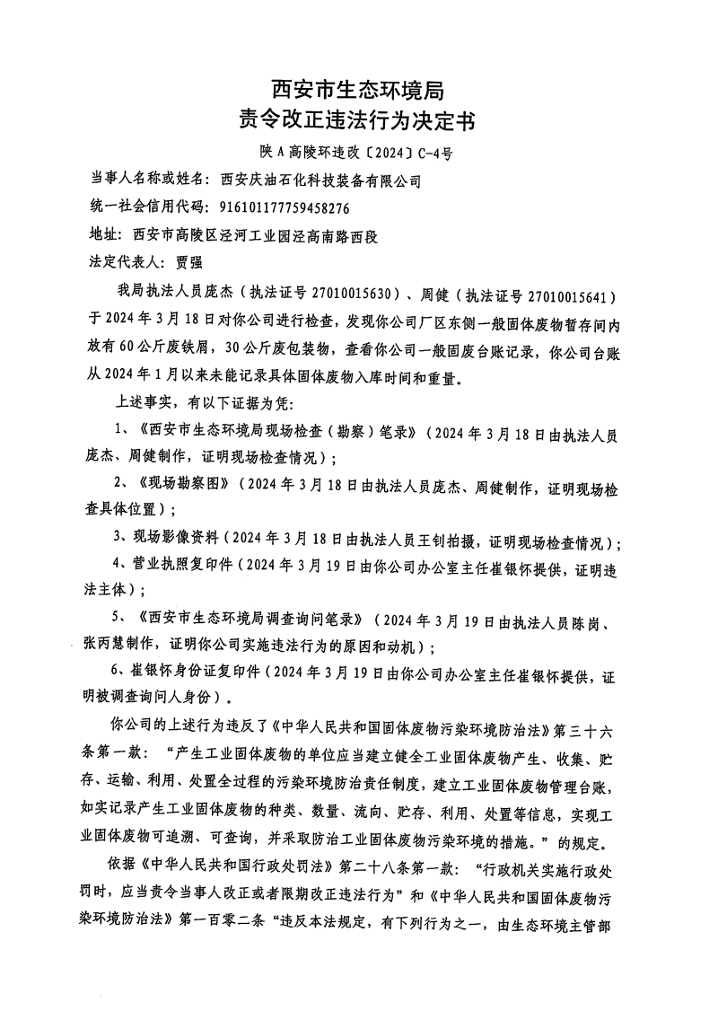 西安市生態環境局高陵分局責令改正違法行為決定書陜A高陵環違改〔2024〕C-4號
