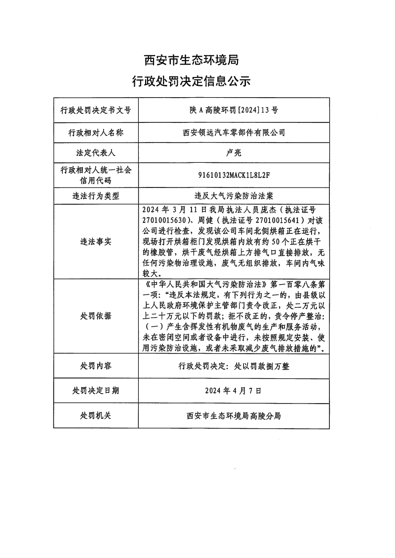西安市生態(tài)環(huán)境局行政處罰決定信息公示陜A高陵環(huán)罰〔2024〕13號(hào)