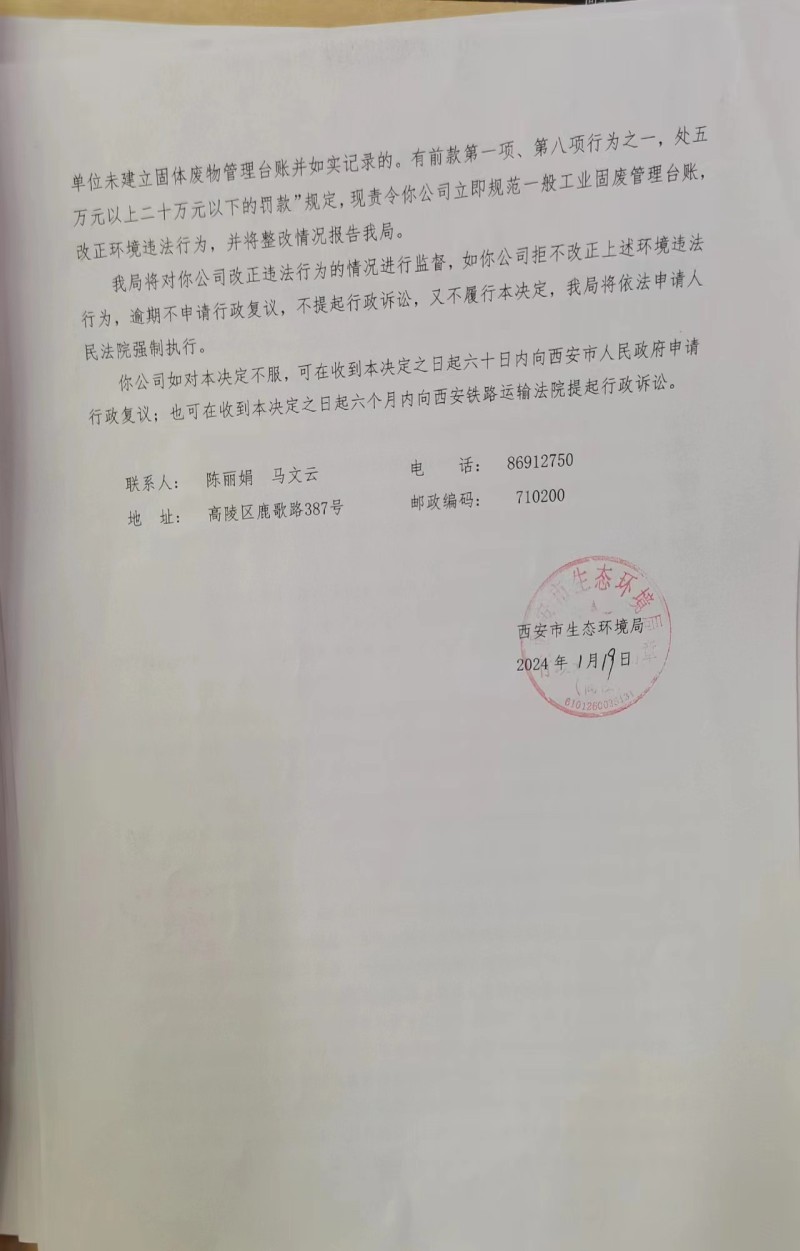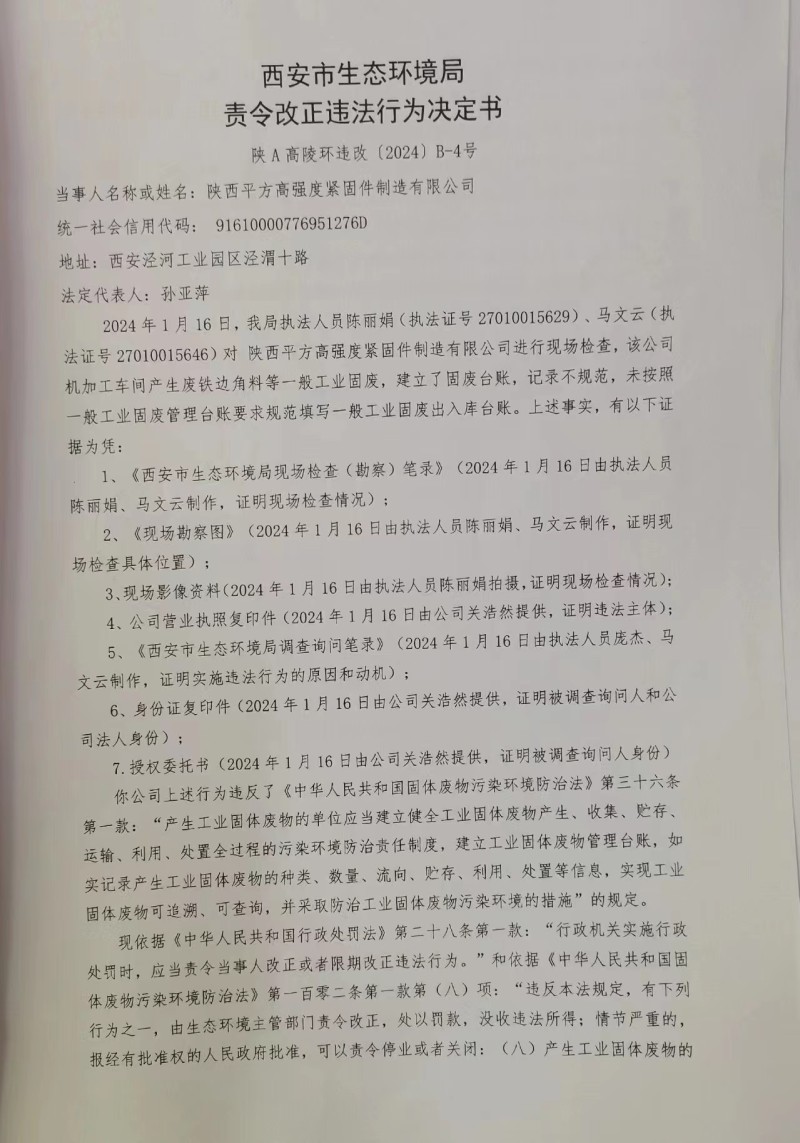 西安市生態(tài)環(huán)境局高陵分局責令改正違法行為決定書陜A高陵環(huán)違改〔2024〕B-4號 |