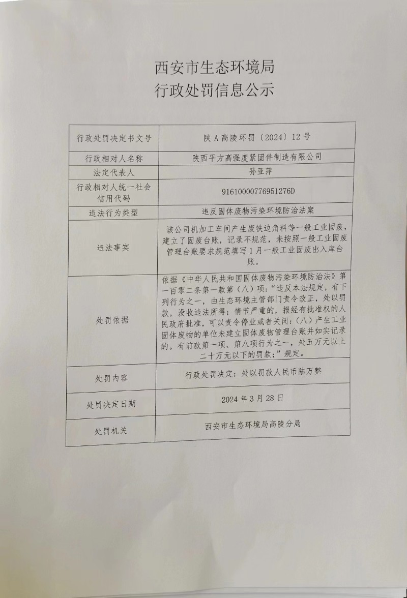 西安市生態環境局行政處罰信息公示陜A高陵環罰〔2024〕12號