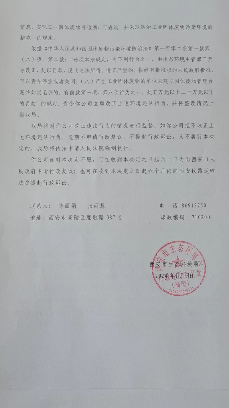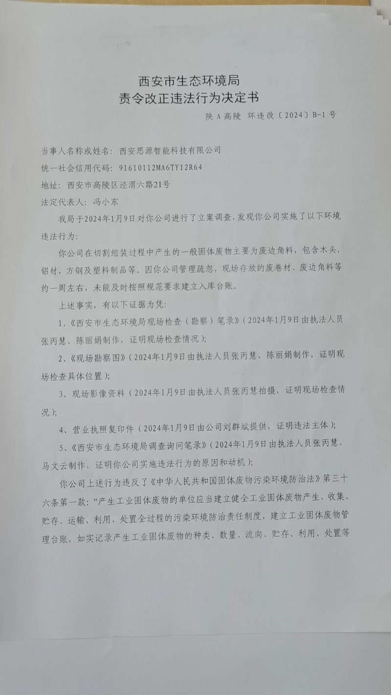 西安市生態環境局高陵分局責令改正違法行為決定書陜A高陵環違改〔2024〕B-1號