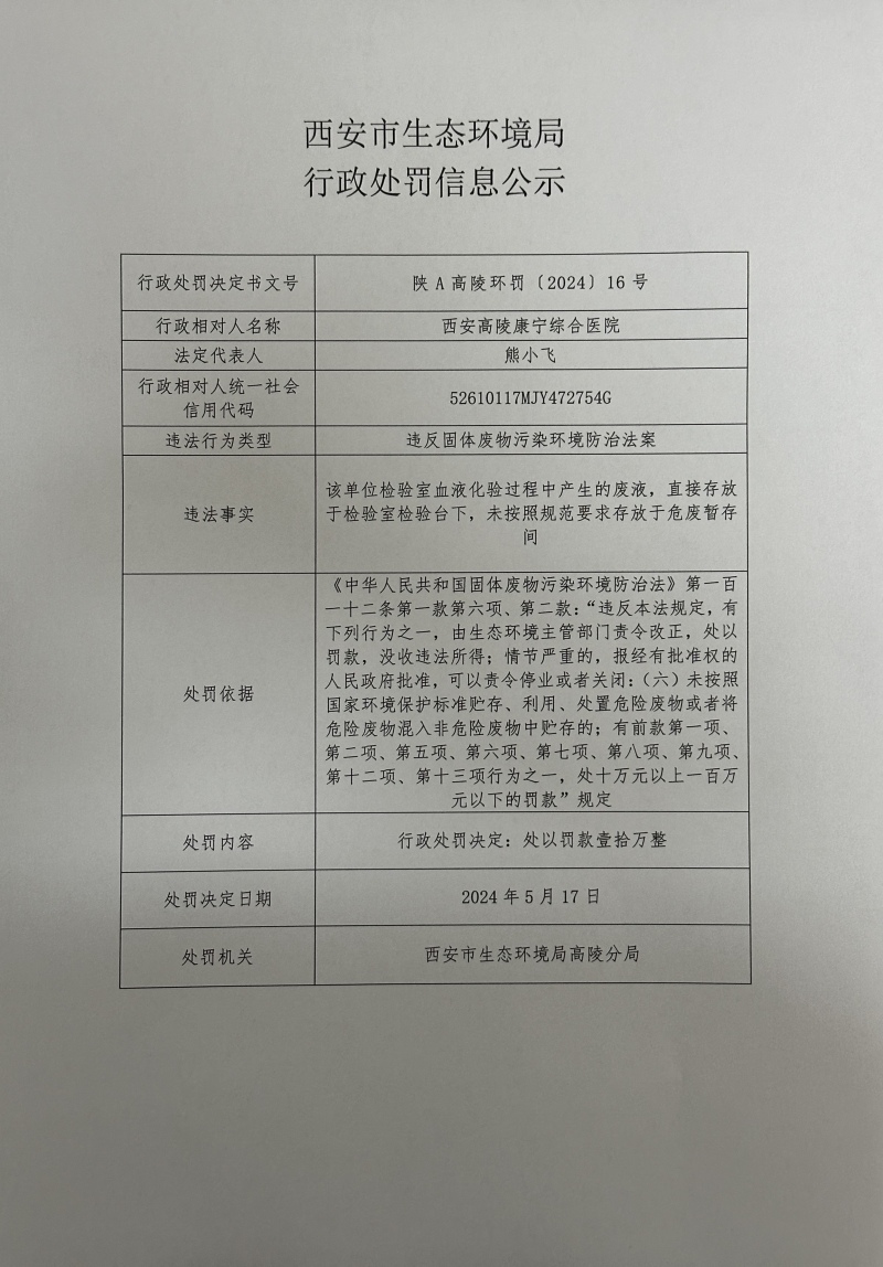 西安市生態環境局行政處罰信息公示陜A高陵環罰〔2024〕16號