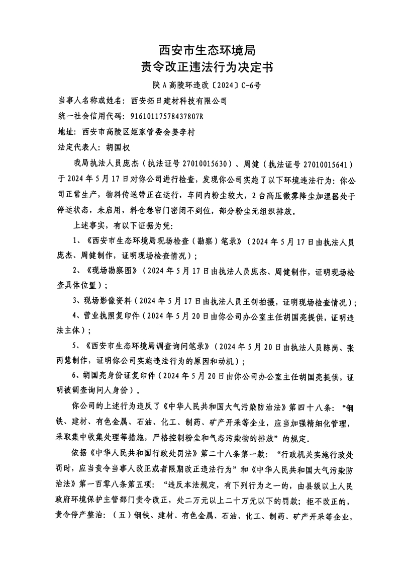 西安市生態(tài)環(huán)境局高陵分局責(zé)令改正違法行為決定書陜A高陵環(huán)違改C-6號 |