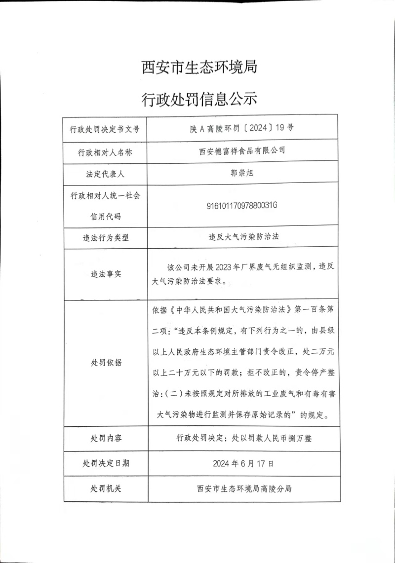 西安市生態環境局行政處罰決定信息公示陜A高陵環罰〔2024〕19號
