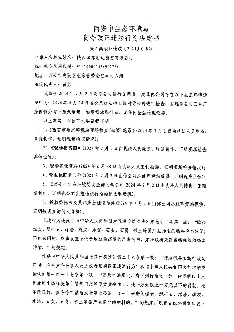 西安市生態環境局高陵分局責令改正違法行為決定書陜A高陵環違改C-8號