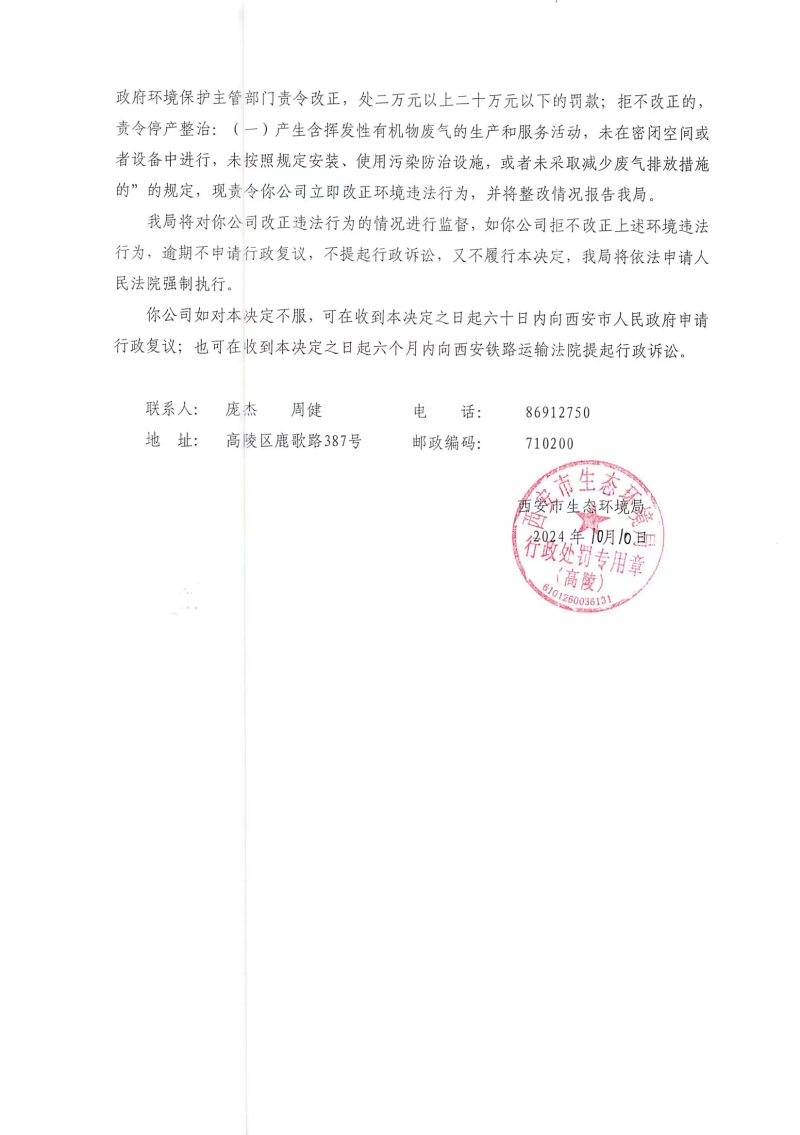 西安市生態環境局高陵分局責令改正違法行為決定書陜A高陵環違改C-9號