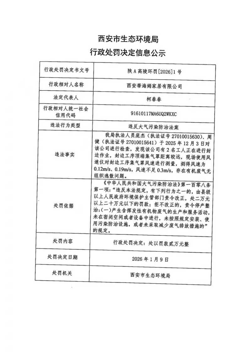 西安市生態(tài)環(huán)境局行政處罰決定信息公示陜A高陵環(huán)罰〔2026〕1號