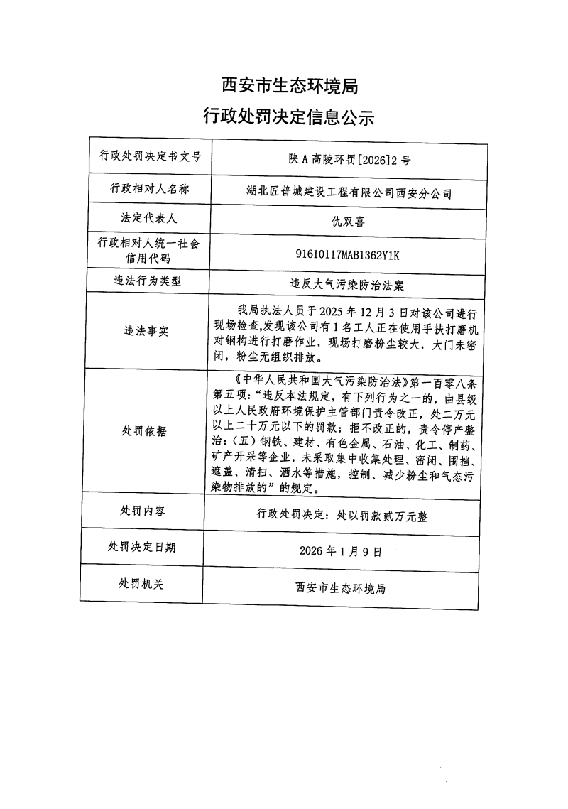 西安市生態環境局行政處罰決定信息公示陜A高陵環罰〔2026〕2號