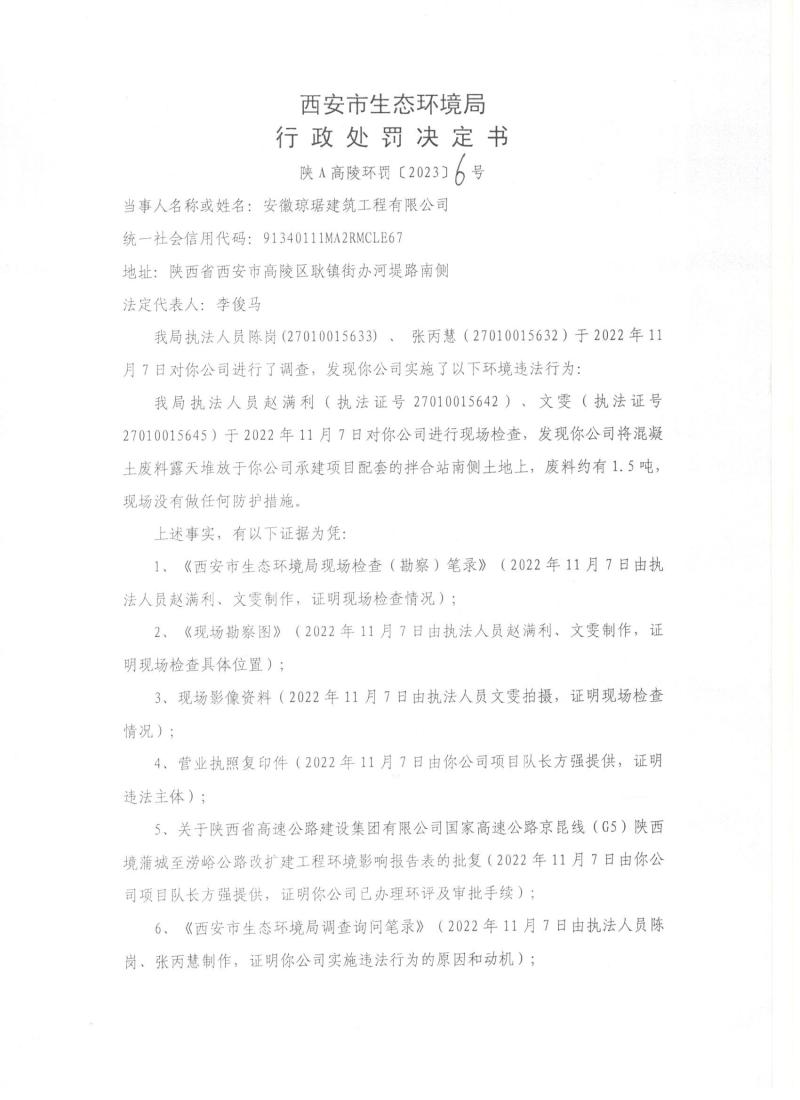 西安市生態環境局行政處罰決定書陜A高陵環罰〔2023〕6號