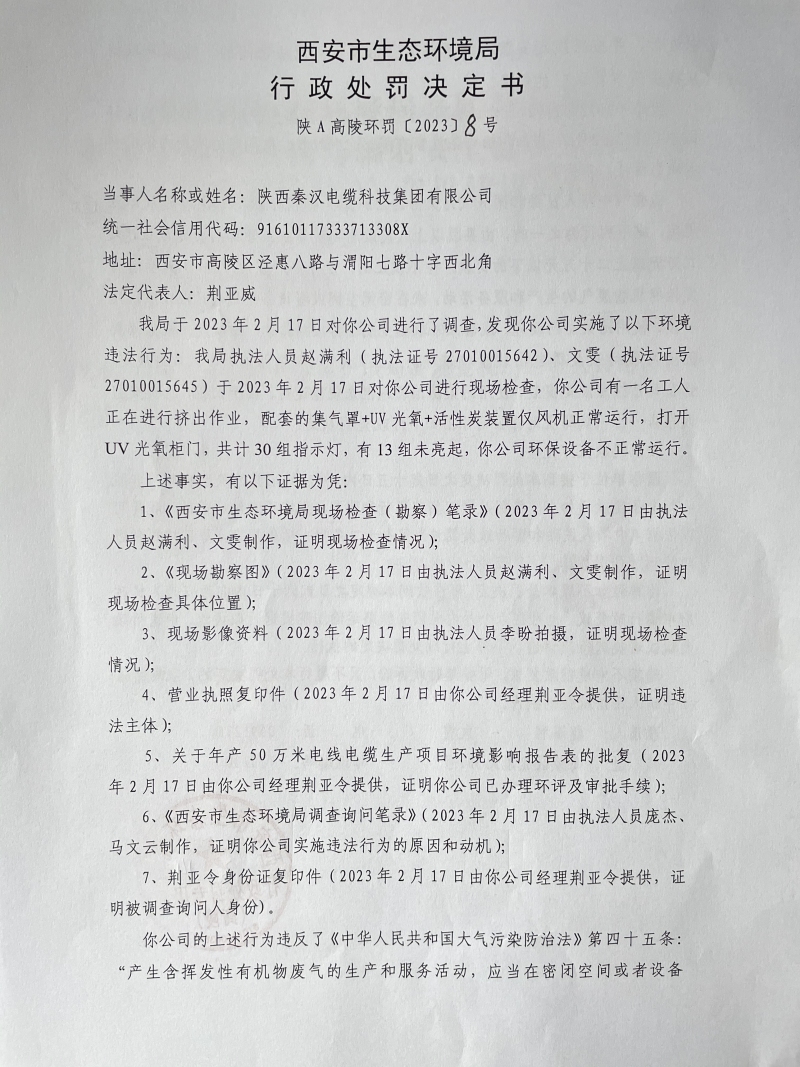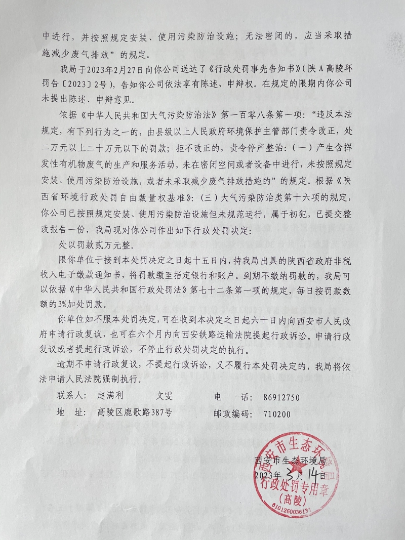 西安市生態環境局行政處罰決定書陜A高陵環罰〔2023〕8號