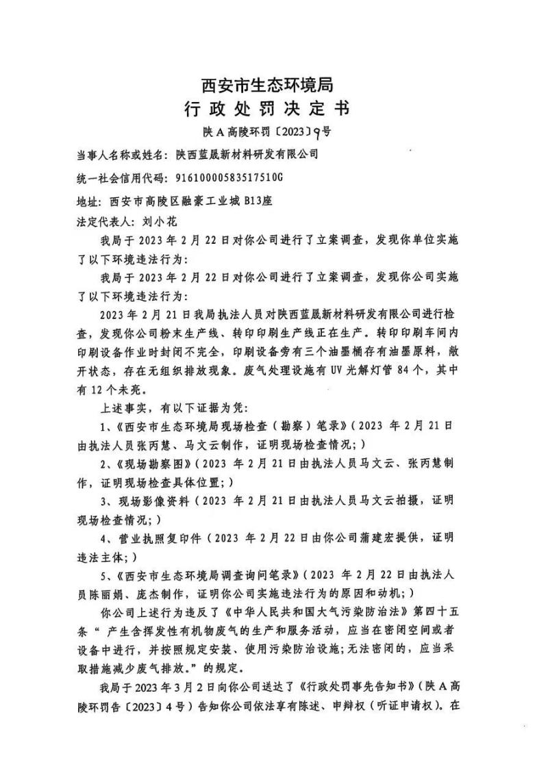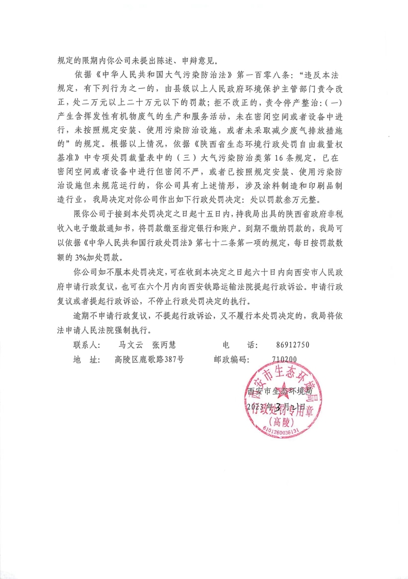 西安市生態環境局行政處罰決定書陜A高陵環罰〔2023〕9號
