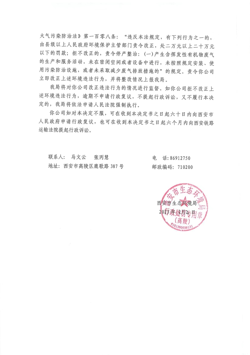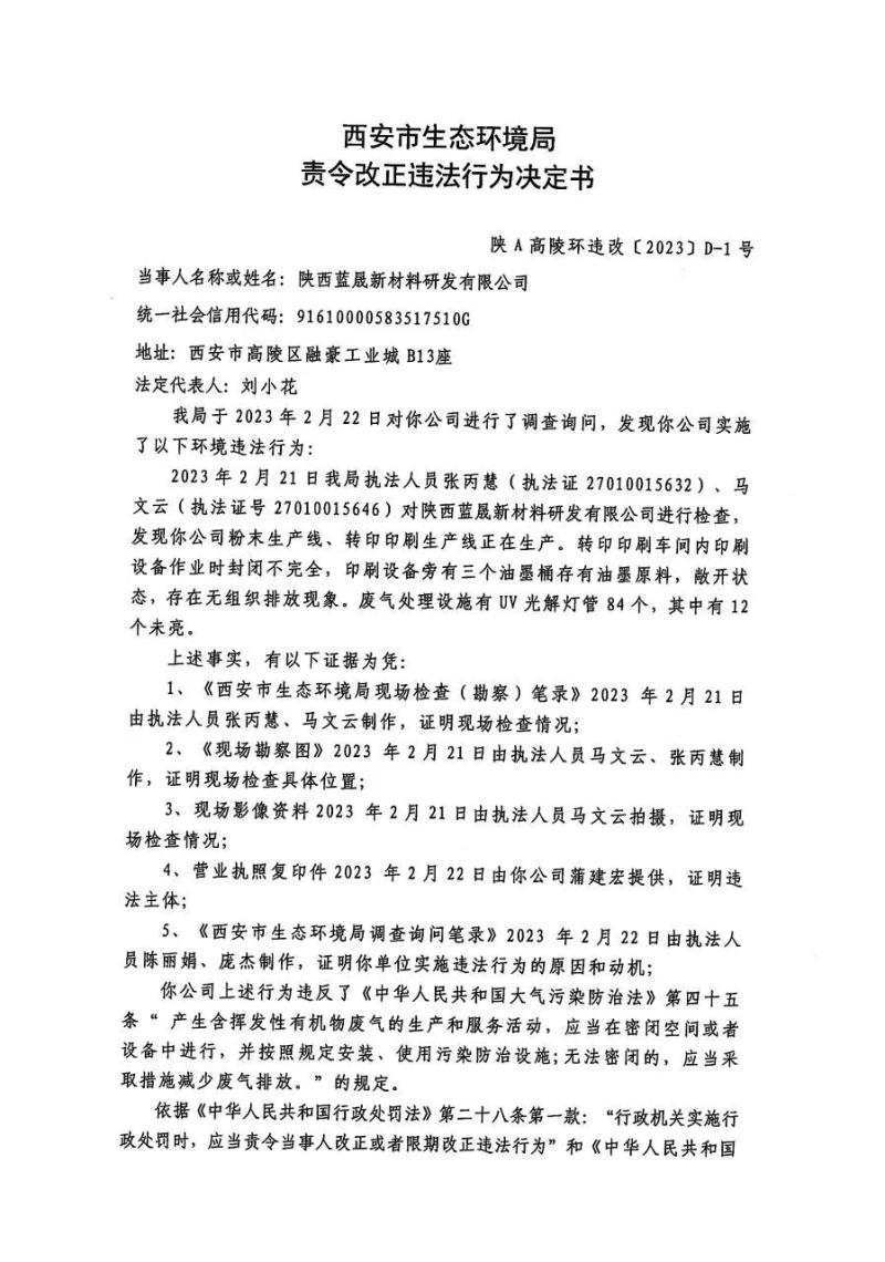 西安市生態環境局高陵分局責令改正違法行為決定書〔2023〕D-1